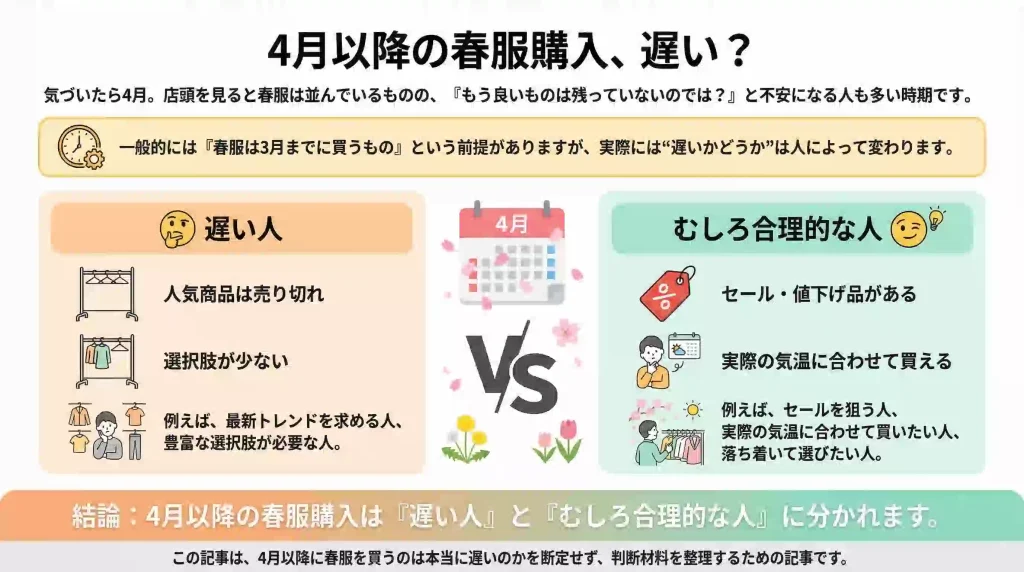 この記事は、4月以降に春服を買うのは本当に遅いのかを断定せず、判断材料を整理するための記事です。
