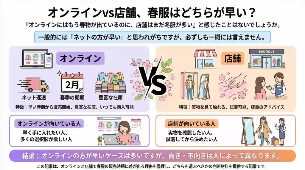 この記事は、オンラインと店舗で春服の販売時期に差が出る理由を整理し、どちらを選ぶべきかの判断材料を提供する記事です。