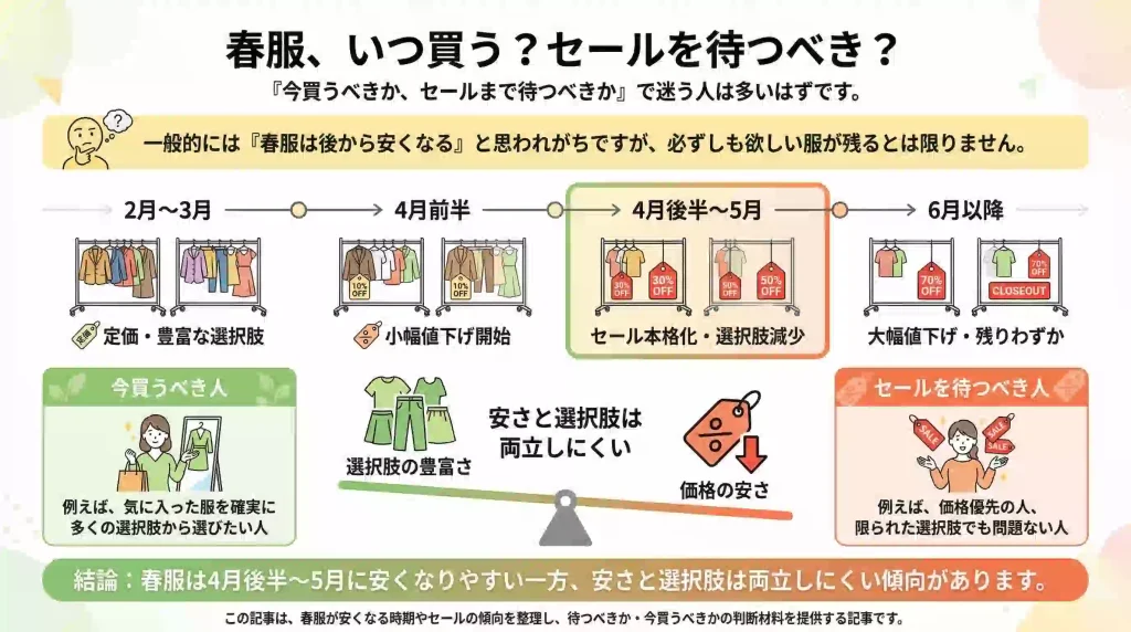 結論:春服は4月後半〜5月に安くなりやすい一方、安さと選択肢は両立しにくい傾向があります。